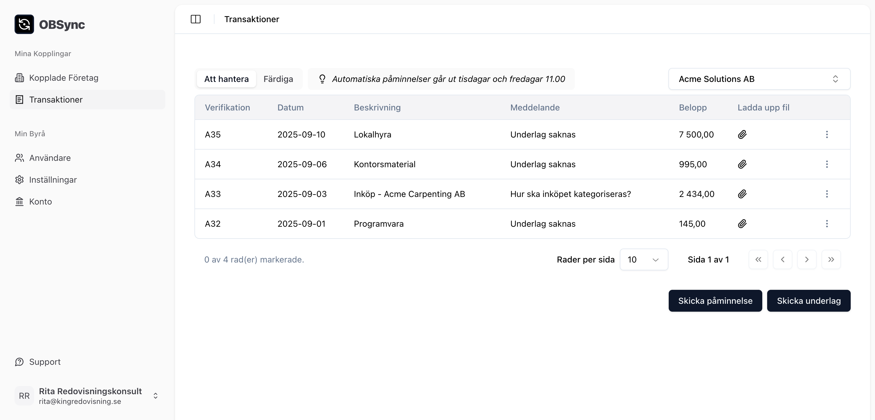 För byrå - OBSync identifierar transaktioner som saknar underlag i bokföringen och påminner kunden automatiskt